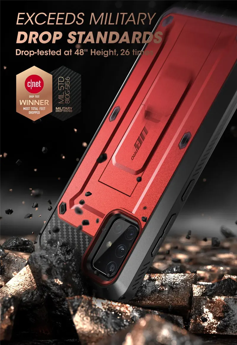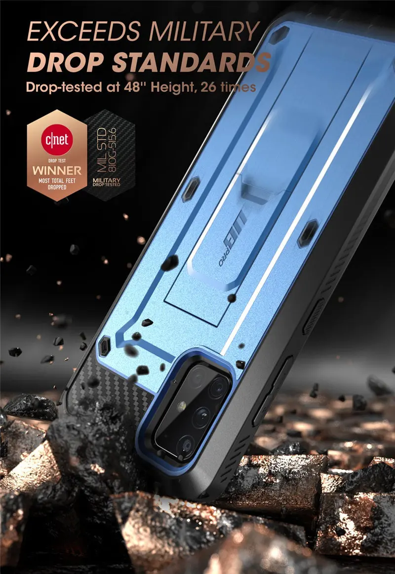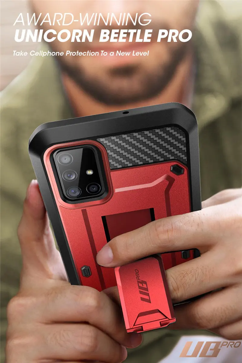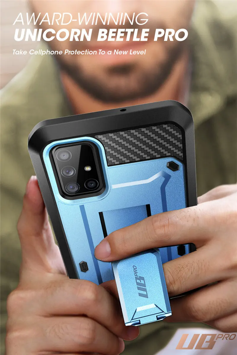 UNICORN BEETLE PRO Full-Body Rugged Case For Galaxy A71 5G (Not Fit For A71 5G UW Verizon) Dropped, thrown, and run over by muscle cars, the UB Pro provides full-body, time-tested mobile protection every step of the way. As winner of the annual CNET drop test awards and the thinnest, strongest, most rugged case in the industry, the UB Pro has survived drops from mountains, gunshots, and wipeouts at over 55 MPH. With 360Β° of flexible TPU polycarbonate, a built-in kickstand, and complete protection from dust, dirt, and moisture, it's the ultimate in mobile defense. Shockproof TPU bumper Built-In Kickstand Rotatable Holster Clip Raised Bezels Built-In Screen Protector Wireless Charging Compatible