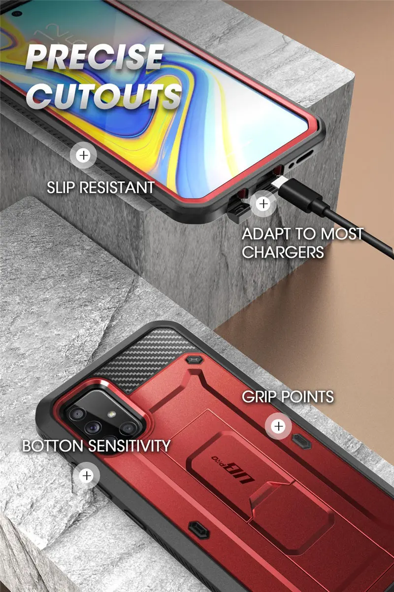 [20-Foot Drop Tested]: Multi-layered TPU and Polycarbonate materials create ultimate drop protection. [Precise Cutouts]: Easy access to all ports, buttons, and features, thanks to the exact design of the UB Pro. [Built-in Screen Protector]: Guards against scratches without compromising sensitivity. [Kickstand Feature]: Built-in Kickstand supports portrait and landscape hands-free viewing. [Compatibility]: Compatible with Samsung Galaxy A71 5G (2020) ONLY, does Not Fit For A71 and does Not Fit For A71 5G UW Verizon.