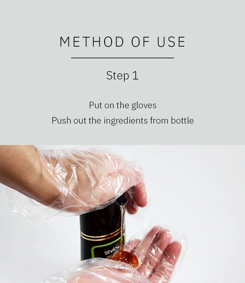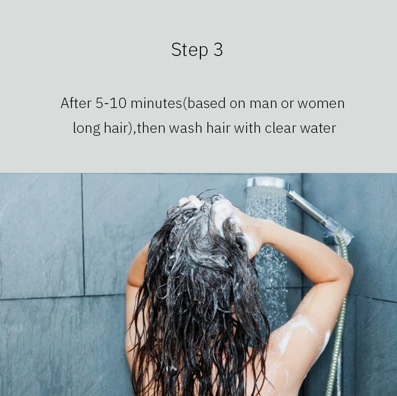 1.Wet your hair and dry your hair with a towel to keep it from dripping but moist. 2.Put on gloves, squeeze out our product and spread it evenly on the hair. 3.Gently massage the hair until the shampoo is evenly applied to the hair, keep the shampoo on the hair for about 5-10 minutes. If your hair is very long, please use 2-3 packs once. 4.Wash your hair and blow dry.