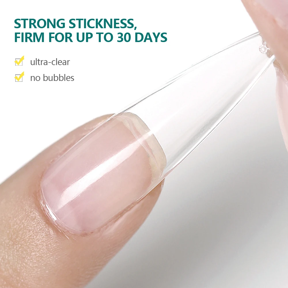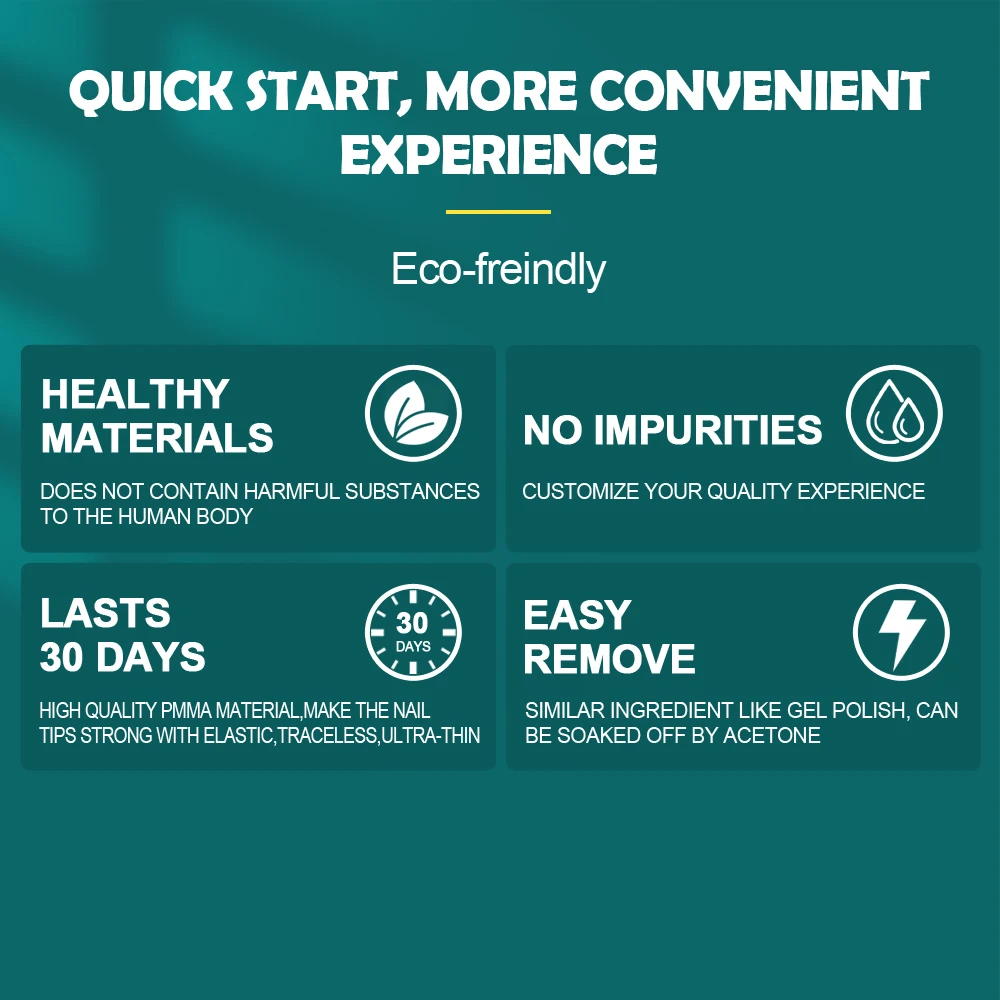 Feature: eco-friendly healthy materials does not contain harmful substances to the human body no impurities customize your quality experience lasts 30 days high quality PMMA material, make the nail tips strong with elastic, traceless, ultra-thin easy remove similar ingredient like gel polish, can be soaked off by acetone