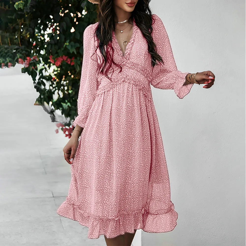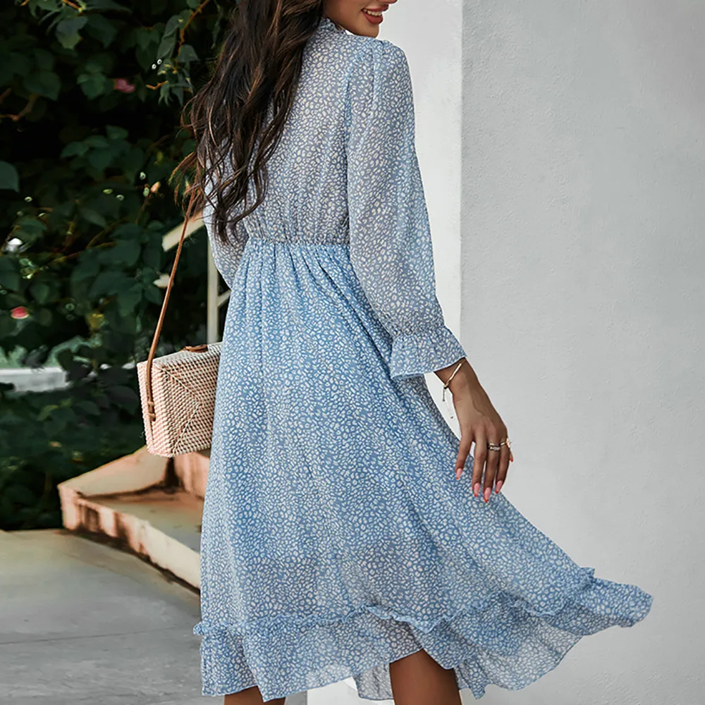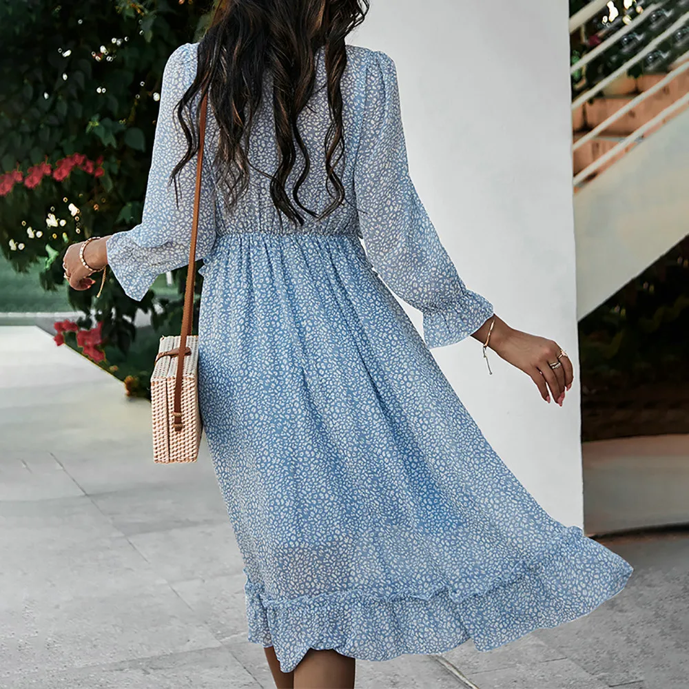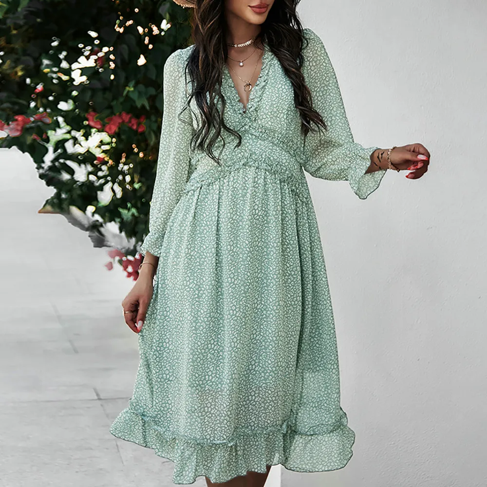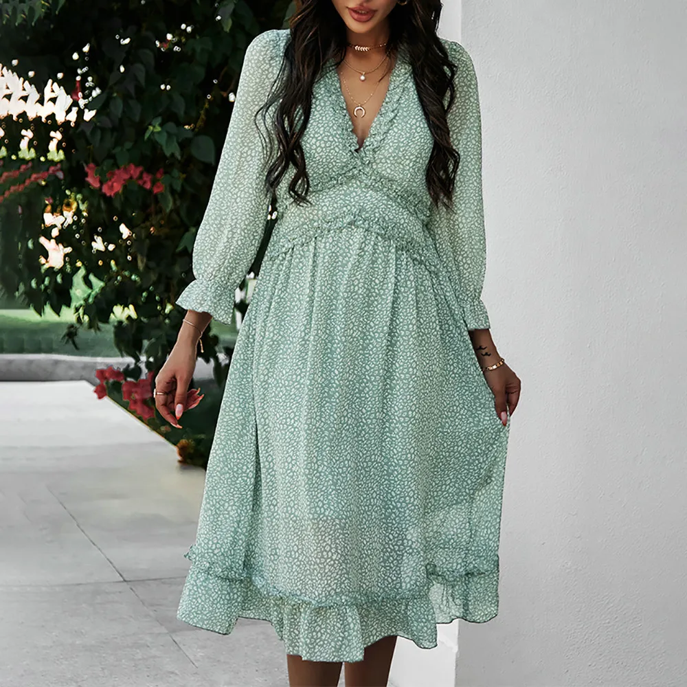 Women's V-Neck Sexy Long Sleeve Ruffle Layer Flowy Swing Midi Dress