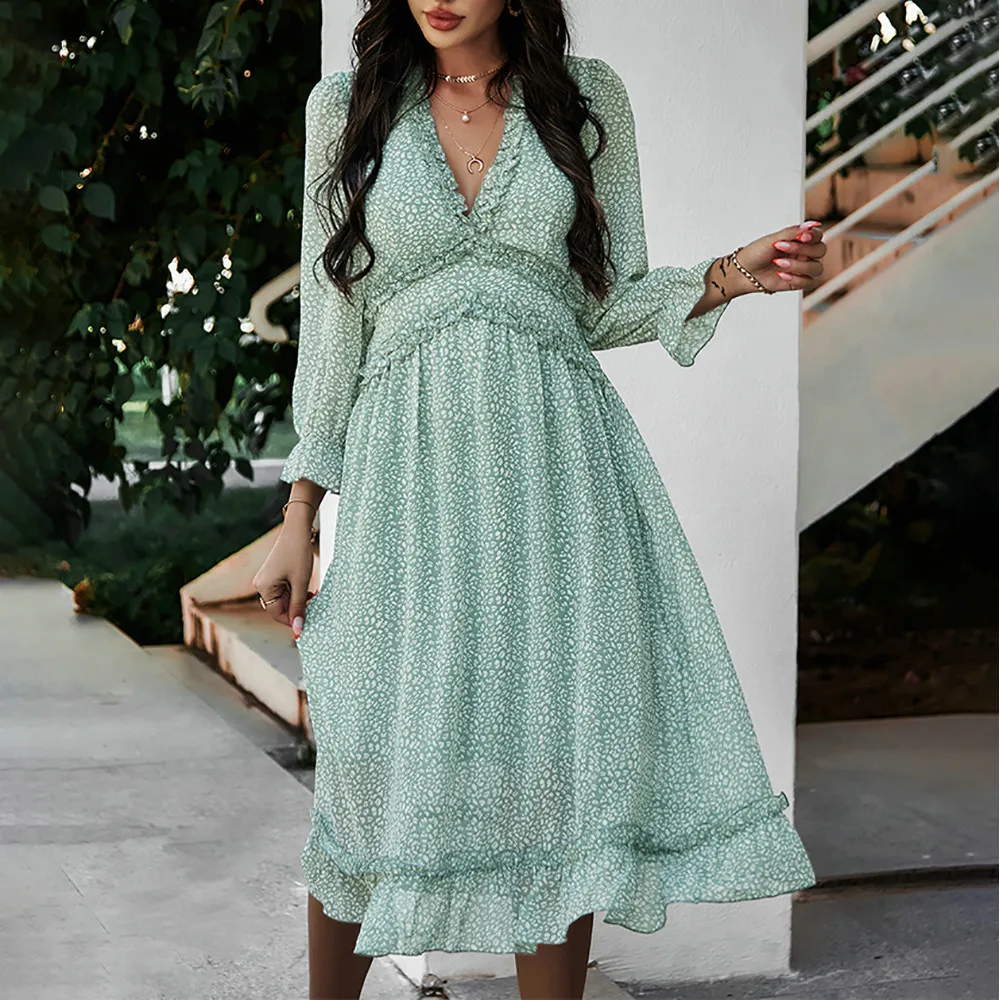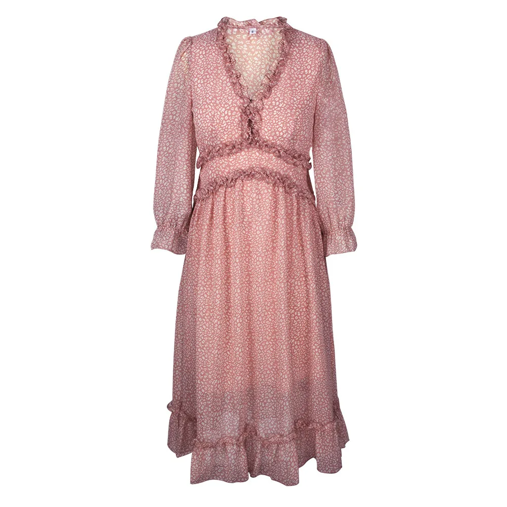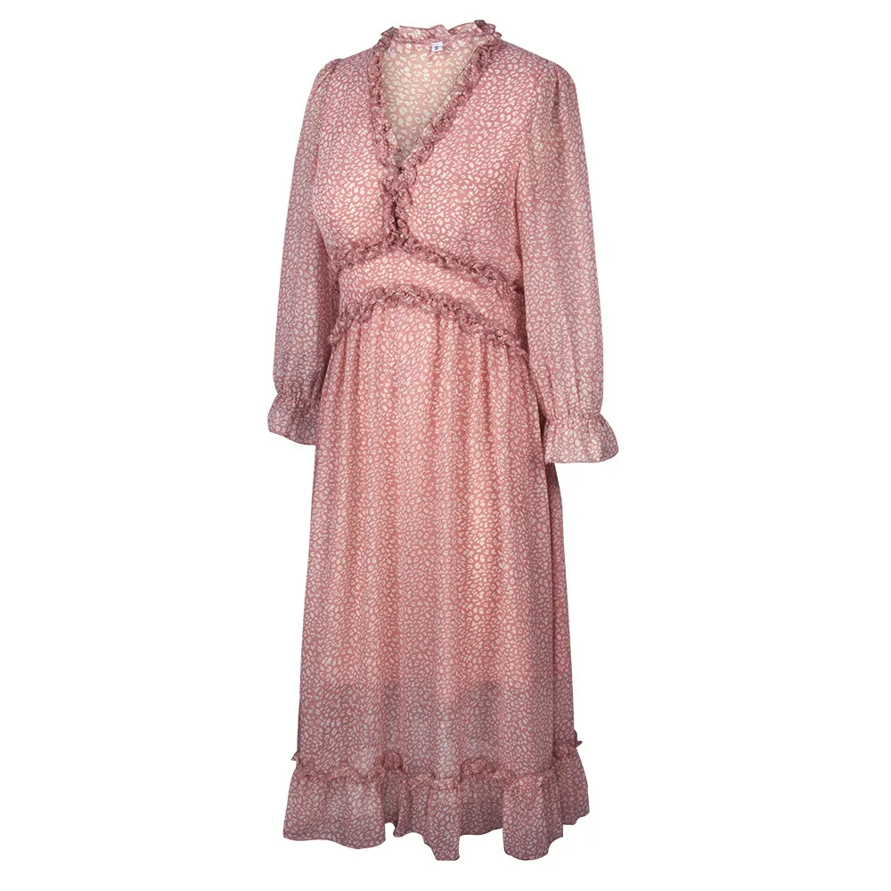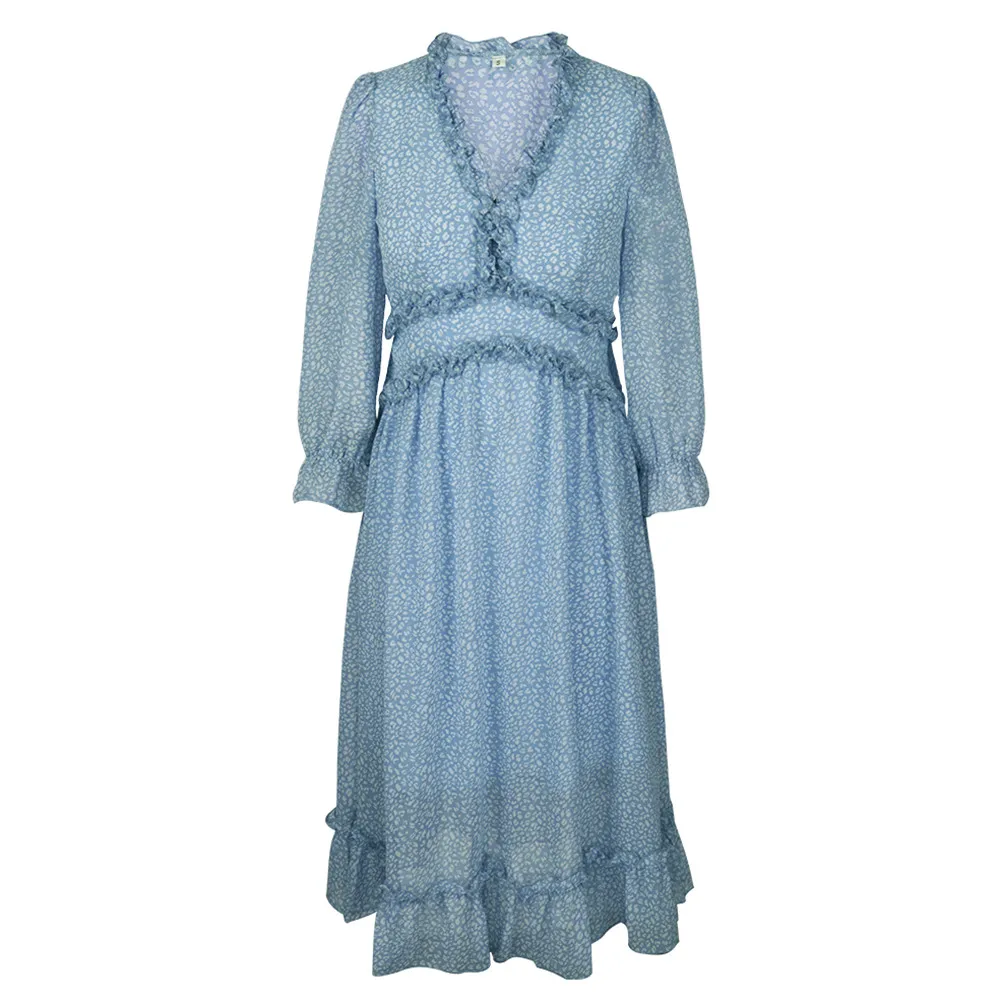 Women's V-Neck Sexy Long Sleeve Ruffle Layer Flowy Swing Midi Dress