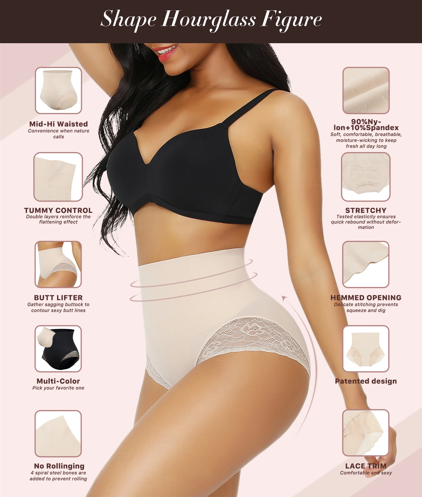 *1. 90% NYLON+10% SPANDEX skin-friendly, soft, breathable, sweat-wicking, keep fresh all day long, with lace trim for decoration. *2. HIGH WAIST provides compression, moderate pressure to shape the waist and abdomen, prevent the accumulation of fat and love handles. *3. TUMMY CONTROL, add an extra layer of fabric near the belly part for targeted and enhanced tummy control. *4. STAY IN PLACE, spiral steel bones prevents rolling and falling when you move. *5. ENHANCE NATURAL CURVE, 3D full-coverage on belly and buttock to create ad sleek line and contour body curve. *6. Patented design.