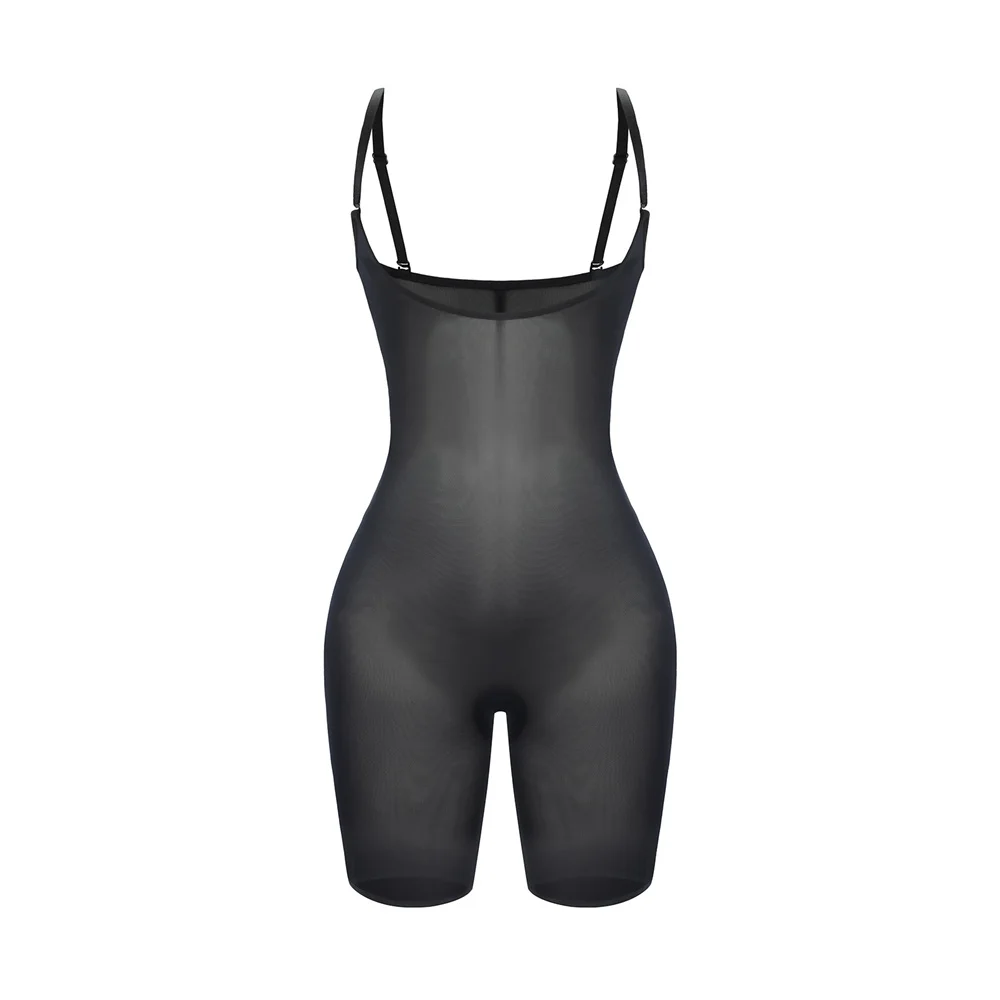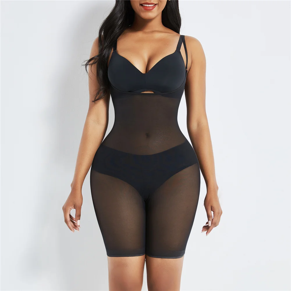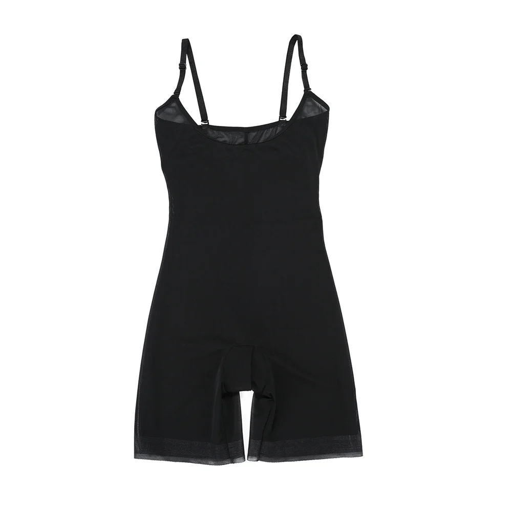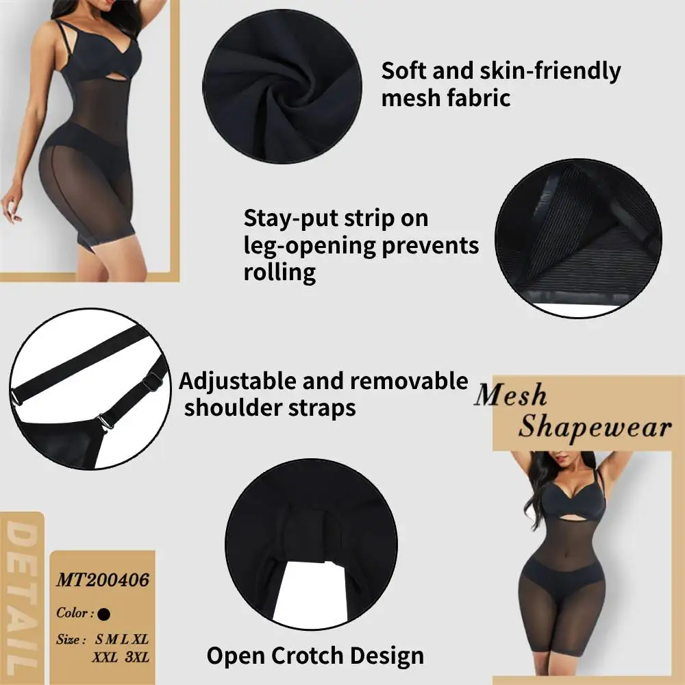 *1. Open bust design accommodates all chest sizes. *2. Soft and skin-friendly mesh fabric creates a sexy see-through curve. *3. Stay-put strip on leg-opening prevents rolling. *4. Adjustable and removable shoulder straps for a snug fit. *5. Open gusset design for ease when nature calls.