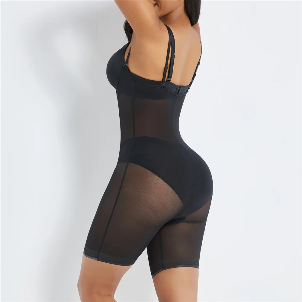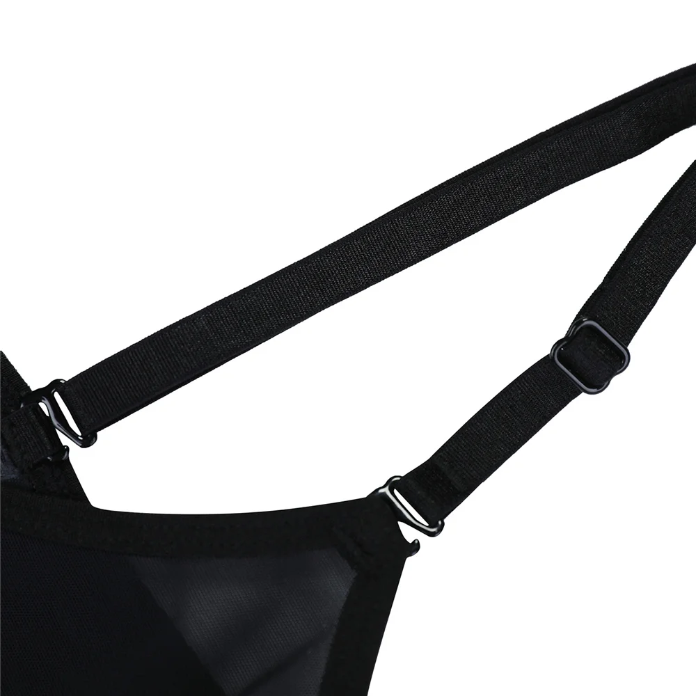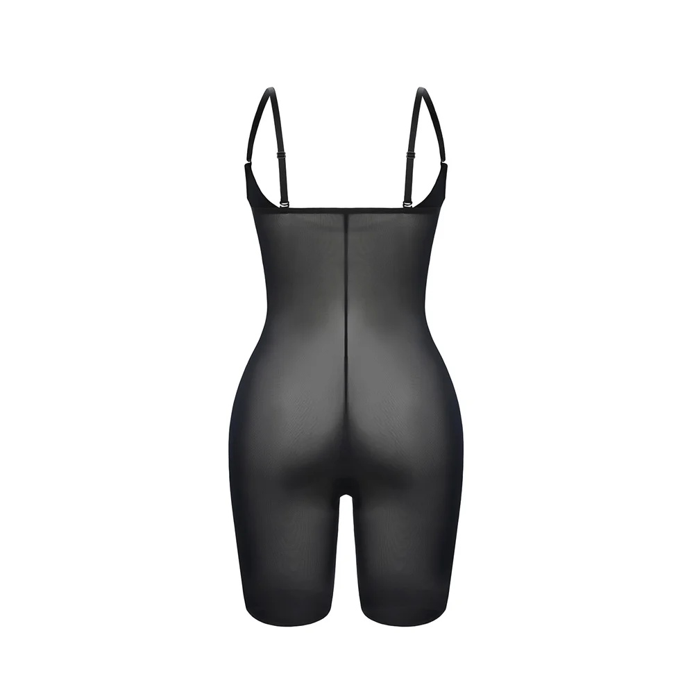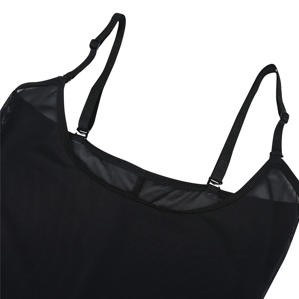 *1. Open bust design accommodates all chest sizes. *2. Soft and skin-friendly mesh fabric creates a sexy see-through curve. *3. Stay-put strip on leg-opening prevents rolling. *4. Adjustable and removable shoulder straps for a snug fit. *5. Open gusset design for ease when nature calls.