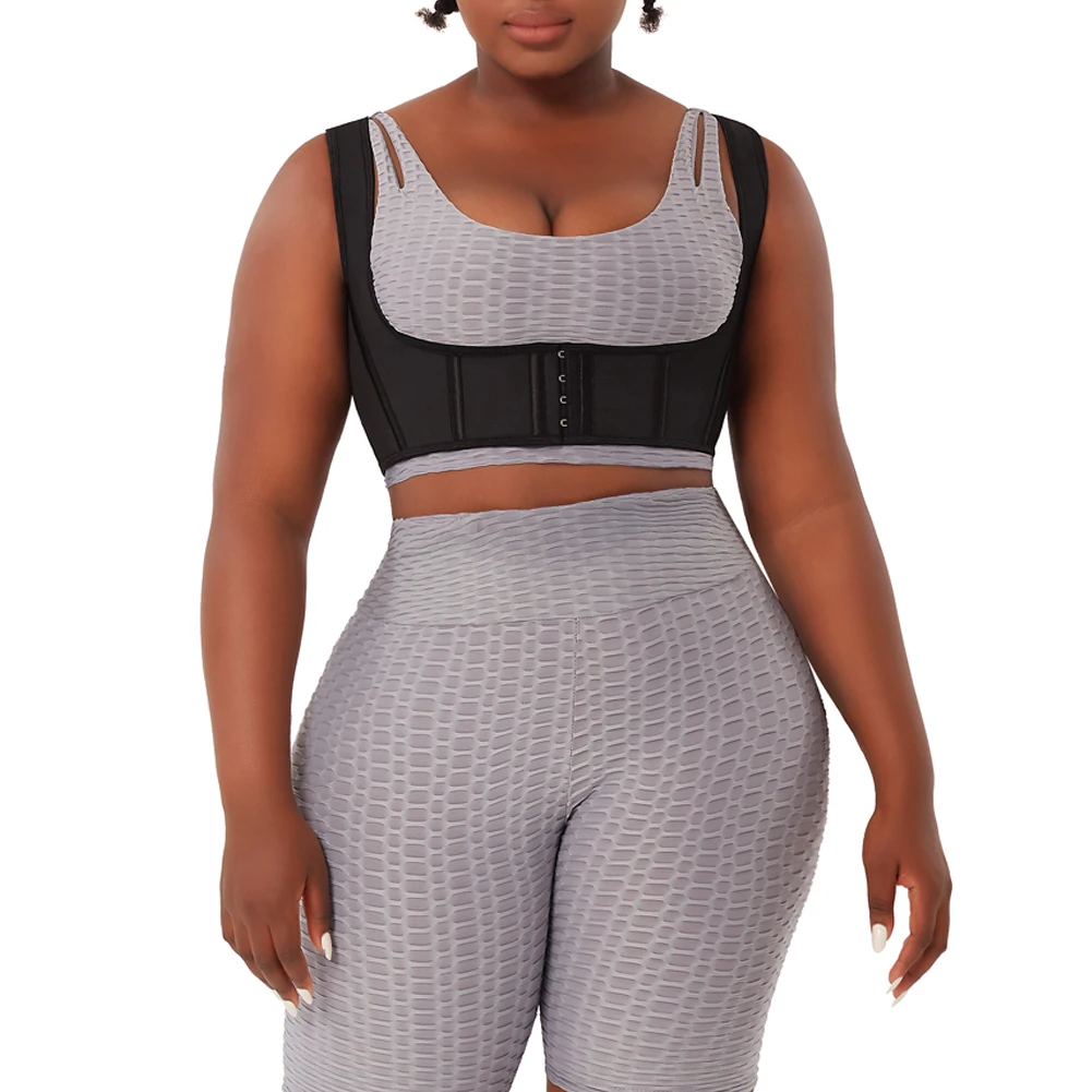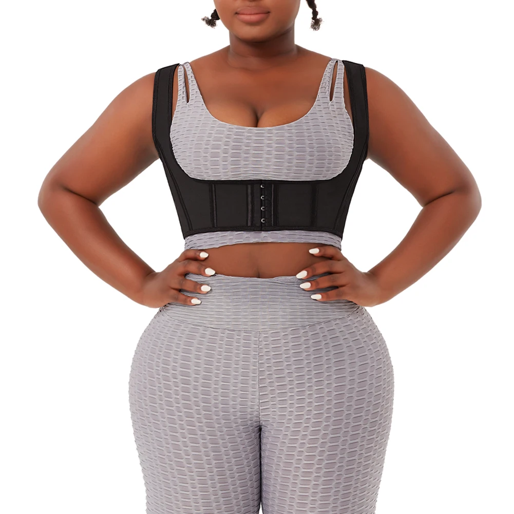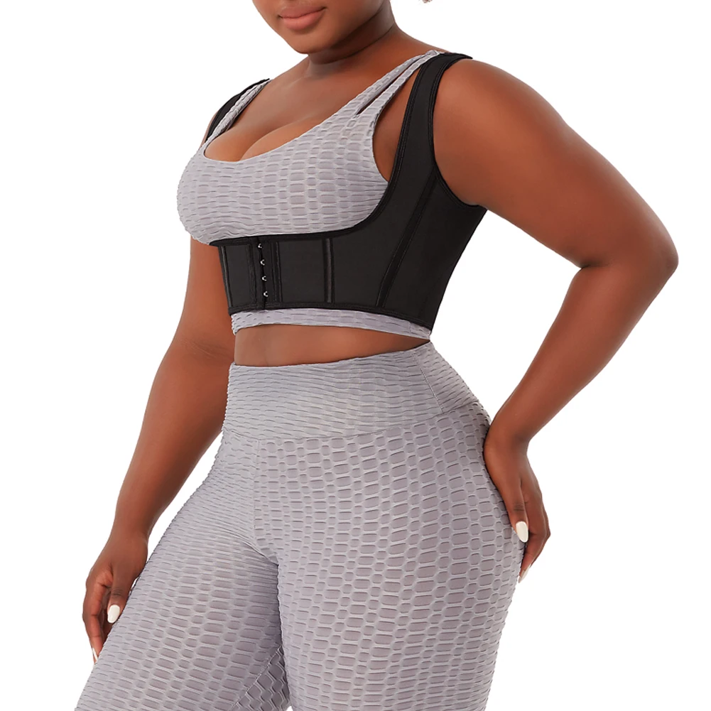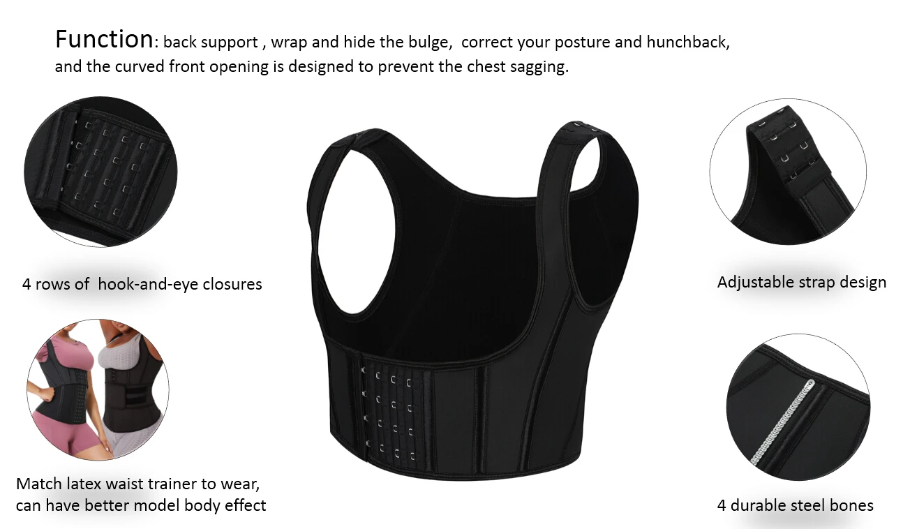 *1. 96% cotton and 4% spandex lining, 100% latex covering. *2. The 3-panel splicing structure provides support on your back, wrap and hide the bulge, correct poor postures, and the curved front opening is designed to prevent the chest sagging. *3. 4 steel bones are added to increase the support effect, in a tiled structure to reduce bra-bulge, while retaining the flexibility and agility during activities. *4. Apply hook and eye closures on the waist belt and shoulder straps for convenient adjustment, the reinforced structure ensures its service life. *5. For everyday uses, jogging, running, yoga, fitness, gym, aerobics, and more, cooperate with a waist trimmer to get better slimming effect.