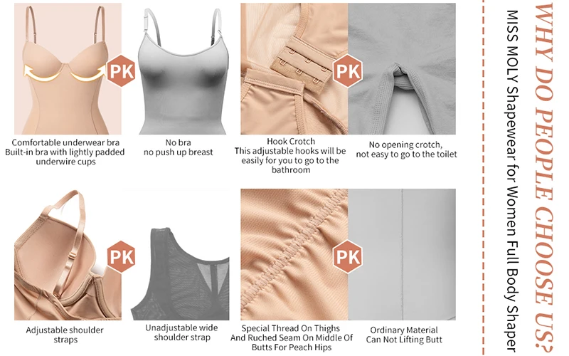 COMFORTABLE AND CONVENIENT. The basic full body shaper for women with the 3 hooks around panty area, is easy bathroom access. The inner lining of tummy control panties makes you more healthy, soft and skin-friendly. Built-in bra with lightly underwire mold cups provides extra coverage and support. And the adjustable straps provide comfort and fit flexibility. All give you a super comfortable fit on your whole body, hug your curves, and will not bother you while wearing it.